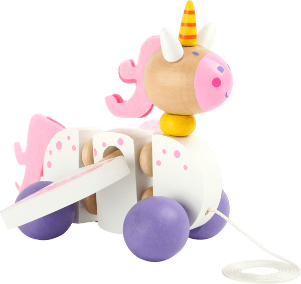 Runde Kugelräder bringen dieses tolle Ziehtier auf Kurs. Gummibänder halten die Gliedmaßen zusammen und machen sie so beweglich. Wird das Einhorn gezogen, wackelt es am gesamten Körper und bringt für die Kleinen eine Menge Spaß.