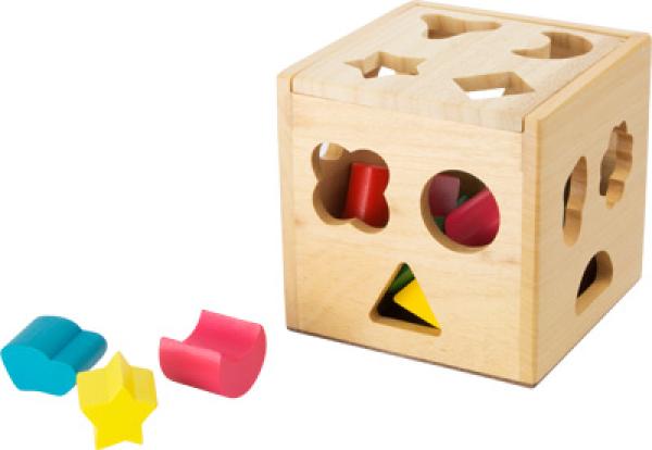 Spielend Farben und Formen erlernen! Dieser robuste Holzwürfel hat an fünf Seiten Aussparungen, durch die jeweils nur ein Holzstein hindurch passt. Ein klassisches Steckspiel zur Schulung der Feinmotorik und Formerkennung.