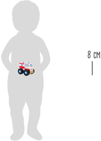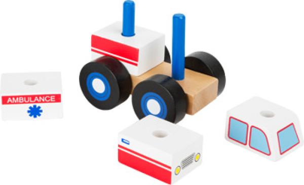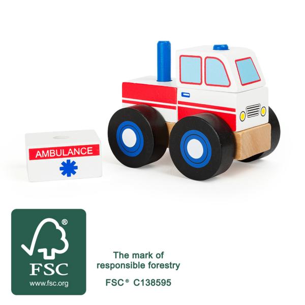 Tatü tata! Der Krankenwagen aus FSC® 100%-zertifiziertem Holz ist bereit für seinen Einsatz. Nur noch schnell die farbigen Holzbausteine in die richtige Reihenfolge stecken und schon kann der Wagen los düsen.